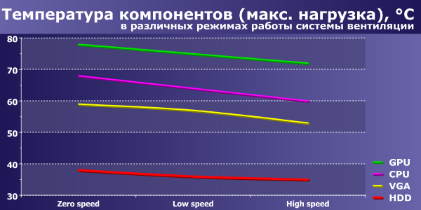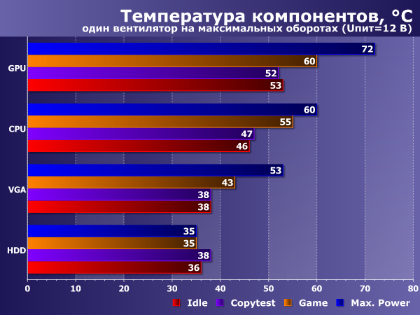 Температура компонентов находится на вполне нормальном уровне при питании корпусного вентилятора как от 12 вольт, так и от 5 вольт. Возрастание температуры при этом не слишком заметно. При отключении корпусного вентилятора температура компонентов еще немного поднимается, но и тут система вентиляции корпуса проявила себя вполне достойно, особенно с учетом использования весьма мощной конфигурации и отсутствия «внешнего выхлопа» у видеокарты.