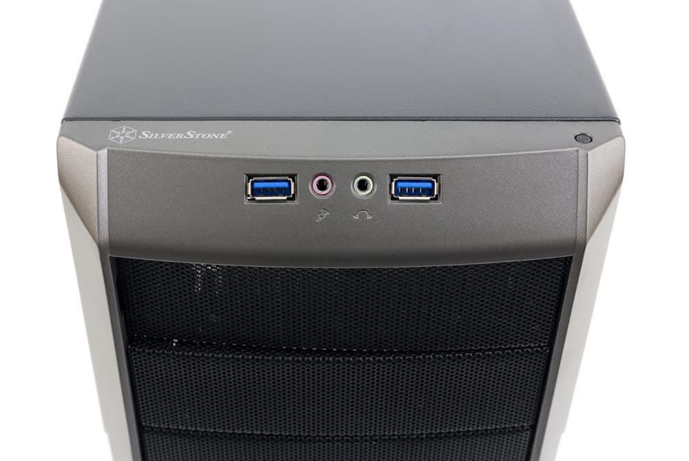 В верхней части передней панели расположились и разъемы — два порта USB (в нашем случае 3.0), разделенные аудиоразъемами. В оба порта USB можно подключать и очень широкие устройства, но лишь если аудиоразъемы свободны. Причем такое расположение портов будет удобно как при настольном, так и при напольном размещении компьютера. Вот только если компьютер стоит на полу, то к кнопке Power придется тянуться.