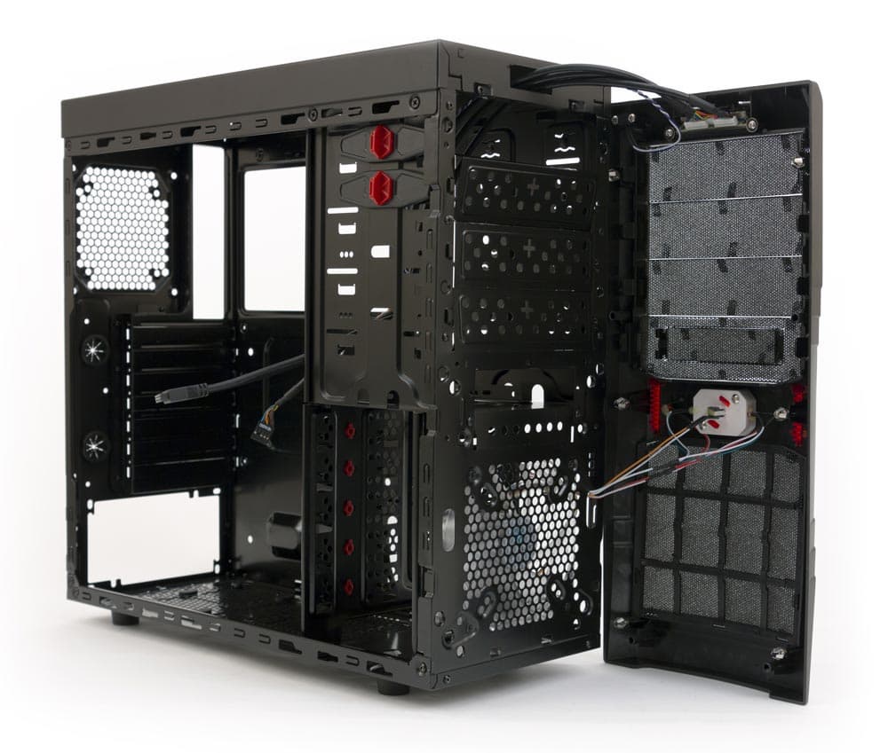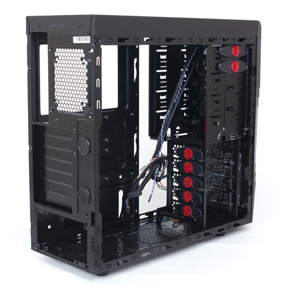 Корпус предусматривает установку до пяти вентиляторов, штатно установлен только один 120-миллиметровый на лицевой панели, который нагнетает воздух к дисковой корзине. Каких-либо контроллеров нет — вентилятор подключается стандартным 3-контактным коннектором к системной плате, через него же подается питание и на красные светодиоды подсветки. Естественно, отключить их нельзя.