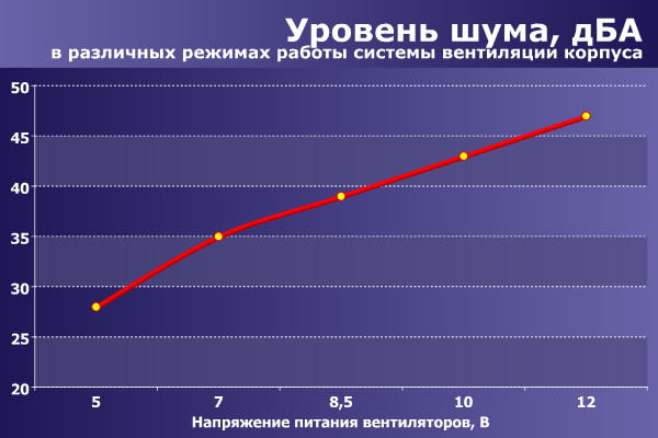 С ростом напряжения питания вентилятора также увеличивается и уровень шума. При питании вентилятора от семи вольт шум системы охлаждения корпуса можно оценить как находящийся на средне-типичном уровне для жилого помещения в дневное время суток. При дальнейшем повышении напряжения питания вентилятора шум уже превышает эргономичный предел в 40 дБА, а при питании вентилятора от 12 вольт достигает значения в 47 дБА. Эксплуатировать устройство с таким уровнем шума в помещении будет не слишком комфортно. С другой стороны, на фоне топовой видеокарты под максимальной нагрузкой и подобный источник может не выделяться.