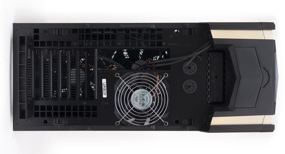 Если продолжать ориентироваться относительно системной платы, то привычные по большинству корпусов верхние вентиляторы должны были бы оказаться в передней части корпуса. Поэтому конструкторы пошли другим путем, более разумным в данной ситуации: поместили вентиляторы на днище шасси. Штатно их там два, причем достаточно необычных: мало того, что они большие — 180 мм, так еще и с возможностью переключения скорости вращения (700 об/мин 18 дБА или 1200 об/мин 34 дБА). Из вентиляторов выходят по два кабеля, один из которых, как обычно, подключается к системной плате, а второй к механическому переключателю скорости. Эти переключатели расположены в той самой выемке, которая помогает снять верхнюю крышку; доступ к ним очень уж удобным назвать трудно, но и пользоваться ими будут не каждые пять минут.