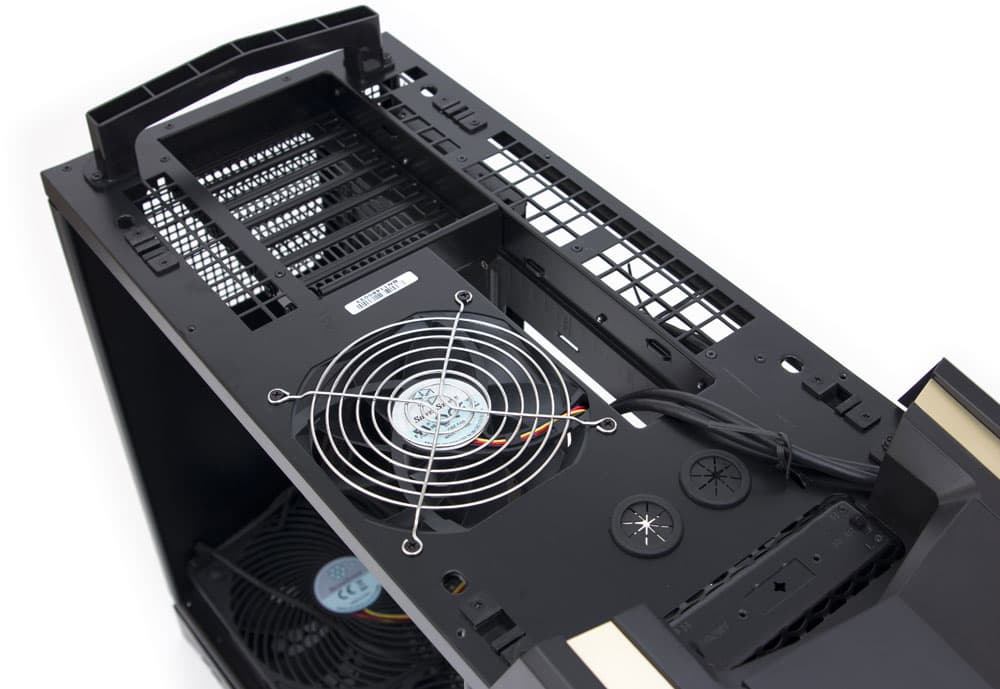 Вместе с портами и платами расширения наверх перекочевал и вентилятор, вытягивающий нагретый воздух из области процессорного кулера. Да и у многих мощных видеокарт выброс нагретого воздуха тоже происходит назад — т.е. в нашем случае вверх. Поэтому верхняя крышка не сплошная, а имеет многочисленные вентиляционные прорези.