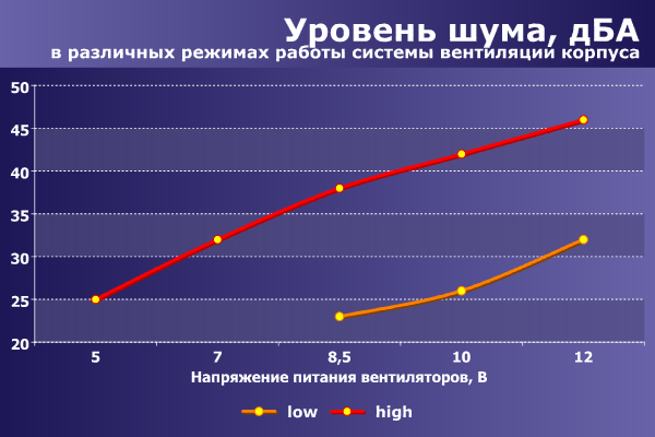 При положении регуляторов «High» шум системы охлаждения корпуса изменяется в широких пределах: от низкого при питании от пяти вольт — и до весьма высокого при питании от 12 вольт. По сути, эргономичный уровень шума достижим при питании вентиляторов напряжением не более 8,5 вольт, но и в этом случае шум от вентиляторов будет весьма заметным.