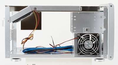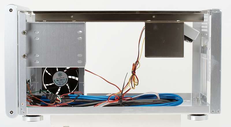 Внутреннее устройство достаточно замысловато, при этом напоминает компоновку корпусов формата Flex-ATX. Системная плата располагается горизонтально на нижней стенки корпуса, над ней, также горизонтально, размещается стандартный блок питания формата ATX. В нижней части ближе к передней панели расположена съемная корзина для двух жестких дисков, устанавливаемых перпендикулярно длинной стороне корпуса. В верхней части расположен отсек с внешним доступом для двух устройств типоразмера 5,25 дюйма.