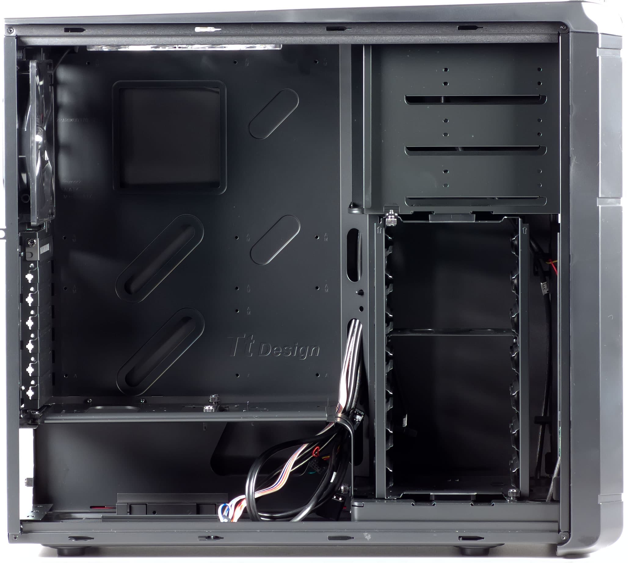 В целом, данная модель представляется близким аналогом среднебюджетных решений типа Cooler Master 590 и Antec Three Hundred, однако, имеющим ряд усовершенствований конструкции. Так к полезным, с точки зрения автора, техническим решениям относятся: уплотнения по периметру боковых панелей, наличие, пусть и простого, контроллера вентиляторов, а также конструкция крепления передней панели, оснащенная оригинальным фиксатором. Использование съемного отсека для жестких дисков с учетом его поперечного расположения является довольно спорным техническим решением, так как с одной стороны снижает общую жесткость конструкции, а с другой стороны удобство монтажа самих дисков практически не повышает. Можно предположить, что за счет использования данного технического решения конструкторы пытались нивелировать неудобства, связанные со сравнительно небольшим внутренним пространства корпуса, предназначенного для монтажа основных компонентов (платформы). Съемное ребро жесткости также является неоднозначным решением, так как заметно осложняет процесс сборки, а его влияние на общую жесткость конструкции заметить на первый взгляд не удалось.