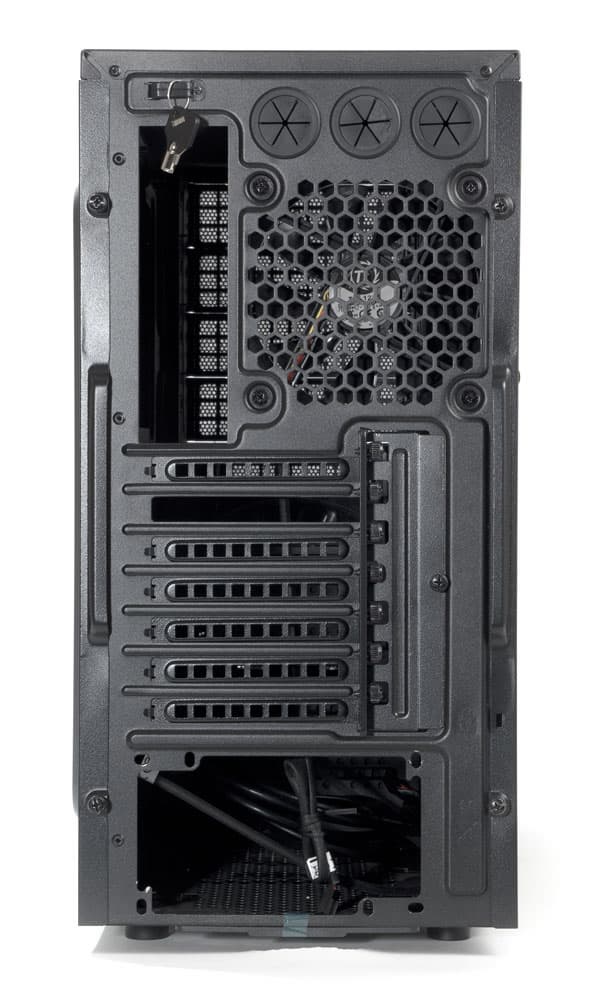 Штатный набор вентиляторов богатым не назовешь: их всего два — на лицевой и на задней панелях шасси. Конечно, оба имеют наклейку с логотипом Thermaltake.