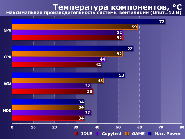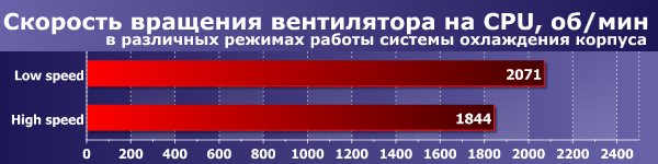 Система охлаждения без проблем справляется с достаточно мощными конфигурациями, тем не менее, ее эффективность не слишком высока. Вместе с тем можно отметить, что система охлаждения корпуса достаточно хорошо сбалансирована, это подтверждается фактом увеличения температуры всех компонентов при снижении производительности системы вентиляции корпуса. Скорость вращения вентилятора процессорного кулера при этом также возрастает.