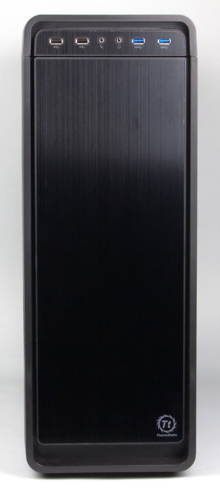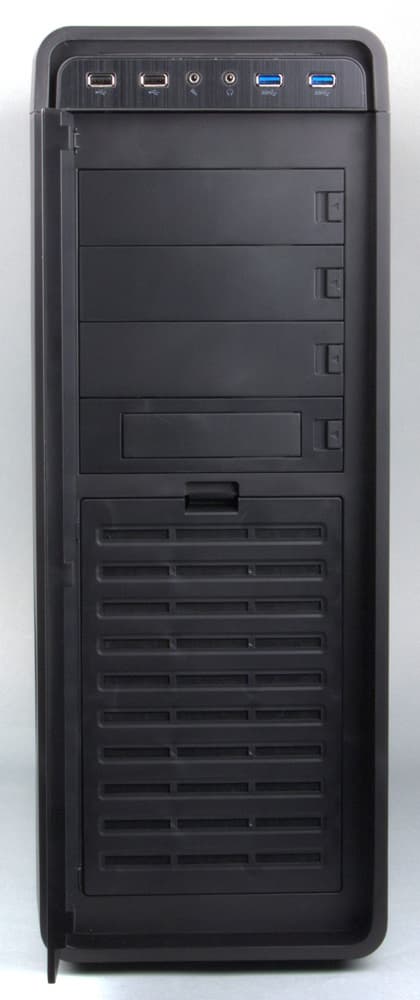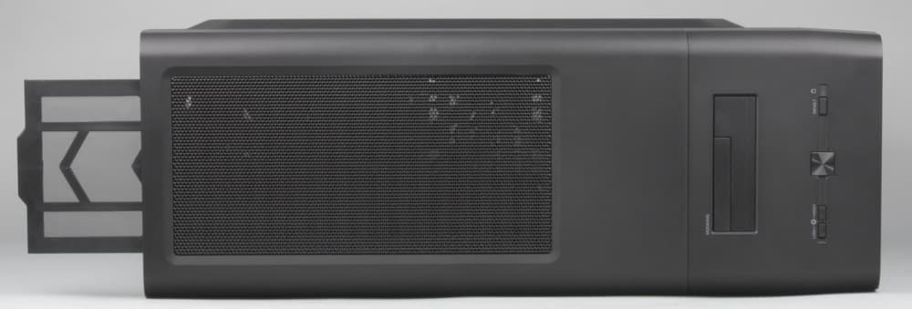 При взгляде спереди видна сплошная поверхность, окруженная выделяющейся рамкой со скругленными углами, и лишь в верхней части есть группа разъемов. Конечно, и слоты для оптических накопителей, и решетка вентилятора спереди имеются, просто всё это закрыто дверцей, о которой мы говорили выше. Получается элегантно, но очень непрактично: во-первых, дверца открывается справа налево, а переставить петли нельзя. К тому же угол открытия ровно 90 градусов, и если системный блок будет стоять справа от оператора, то работать с расположенными за дверцей устройствами будет не слишком удобно. Во-вторых, никаких выступов для захвата рукой на дверце нет: чтобы открыть ее, надо зацепить пальцем за нижнюю кромку дверцы, и если компьютер стоит на полу, то придется каждый раз кланяться…