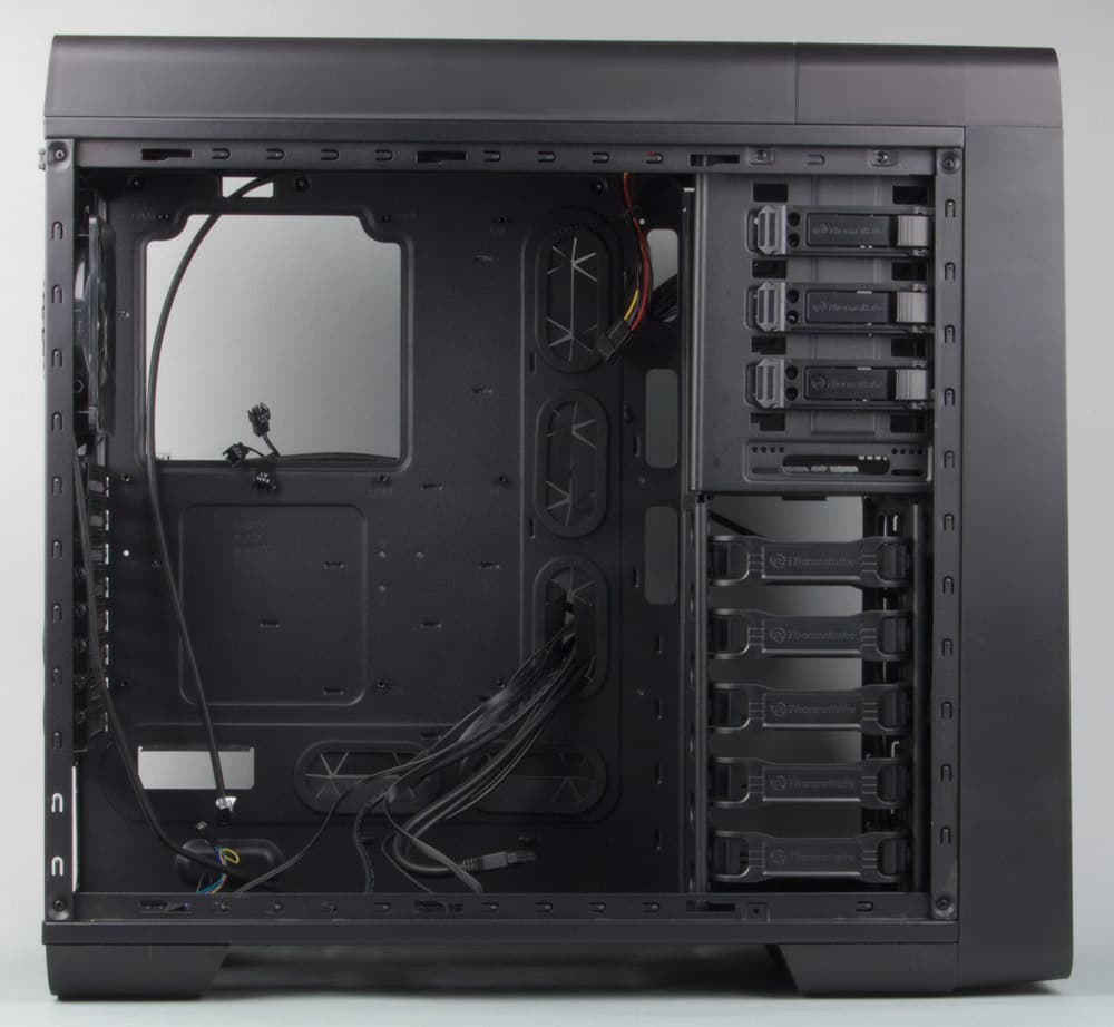 Кабели и шлейфы можно уложить за подложкой системной платы, для чего есть пять больших отверстий, прикрытых резиновыми уплотнителями с разрезными лепестками, и три отверстия поменьше, с завальцованными краями. Предусмотрены и ушки для закрепления пучков кабелей имеющимися в комплекте многоразовыми стяжками. Упоминавшийся выступ на правой боковой стенке позволит не слишком плотно укладывать пучки кабелей.