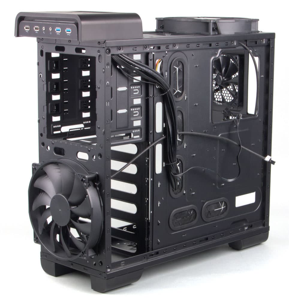Конечно, предусмотрена и возможность модернизации: верхний вентилятор можно заменить одним или двумя 120/140-миллиметровыми, вместо большого фронтального также можно поставить вентилятор поменьше. Еще одно посадочное место для 120/140-миллиметрового вентилятора есть на днище шасси. Конструкция верхней панели допускает установку 240-миллиметровых радиаторов системы жидкостного охлаждения, дополнительно имеются два отверстия, закрытых резиновыми заглушками с разрезными лепестками.