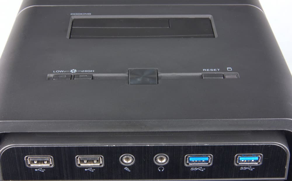 За кнопками и индикаторами находится док-станция для SATA-накопителей. От пыли разъемы защищены подпружиненной шторкой, имеющей секции для 2,5- и 3,5-дюймовых HDD/SSD. Накопители вставляются вертикально, что нужно учитывать при выборе места размещения будущего компьютера: над ним должно быть достаточно места.