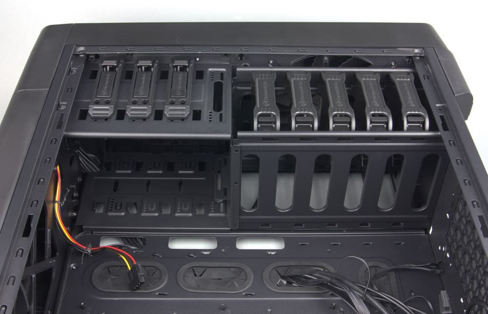 Корзина для жестких дисков поперечная, единая и стационарная, диски в ней размещаются с помощью пластиковых салазок, очень похожих на те, что мы видели в других корпусах Thermaltake. Правда, сходство в основном относится к конструкции защелок, форма же рукоятки такая, как у Chaser A31, но 3,5-дюймовые накопители крепятся не штифтами, а винтами через амортизирующие прокладки, как у Overseer RX-I. Можно установить и 2,5-дюймовые HDD/SSD, закрепляя их винтами.