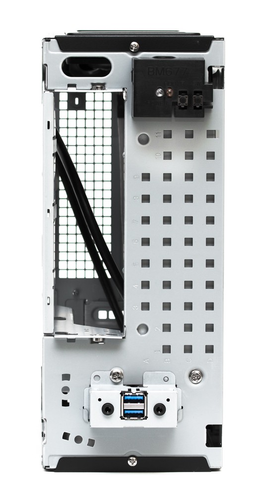 Крепление заглушек для плат расширения раздельное, винтовое. USB-порты c фронтальной панели подключаются монолитной 20-контактной колодкой, при этом переходник на 8-контактную колодку USB 2.0 отсутствует. Аудиоразъемы также подключаются монолитным коннектором с поддержкой стандарта HDA без обратной совместимости с AC’97. Набор проводов для подключения кнопок и индикации представлен традиционной россыпью.