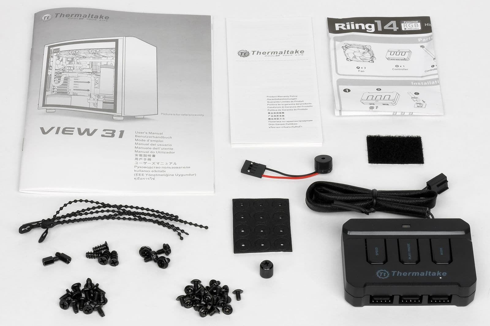 В продаже можно встретить две модификации View 31: TG и TG RGB. В первом случае корпус комплектуется всего двумя вентиляторами типоразмера 120 мм с голубой подсветкой, а во втором в комплект поставки входят уже три вентилятора Thermaltake Riing 14 LED RGB 256 Colors, которые, как нетрудно понять по названию, имеют типоразмер 140 мм и подсветку на основе RGB-светодиодов. Последняя модификация нам и досталась.