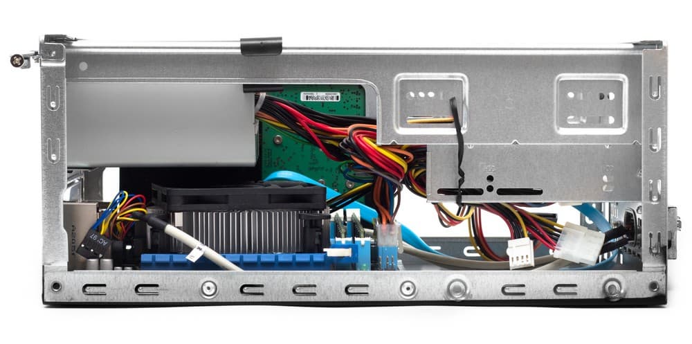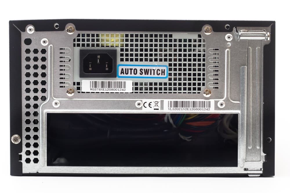 В корпусе установлен блок питания формата SFX в варианте без выштамповки над вентилятором, а в самом БП установлен низкопрофильный вентилятор типоразмера ∅80×15 мм.