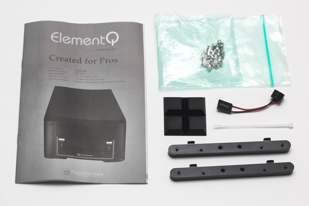 Поставляется корпус в небольшой коробке с качественной цветной полиграфией, большим количеством фотографий и перечнем основных характеристик данной модели. Комплект поставки помимо самого корпуса включает в себя только самое необходимое: крепежные винты, направляющие для монтажа жесткого диска, четыре резиновые ножки, которые нужно наклеивать самостоятельно, одну одноразовую стяжку, спикер и небольшую инструкцию по сборке.