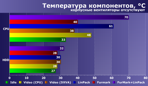 - Video (CPU) и Video (DXVA) — просмотр видеоролика Full HD (BDRemux) с помощью плеера VLC 2.0 с выключенным и включенным аппаратным декодером в течение 1 часа.