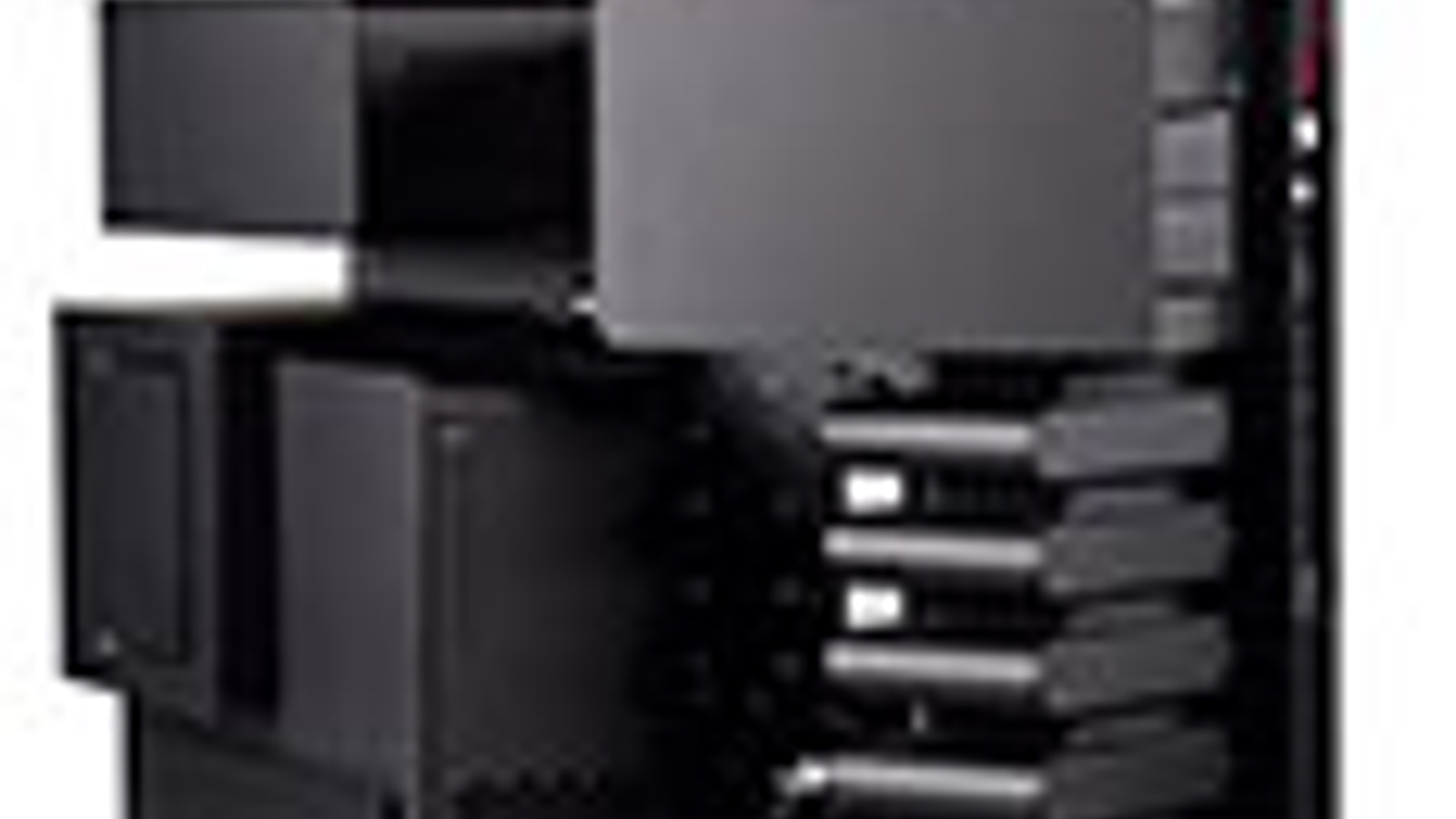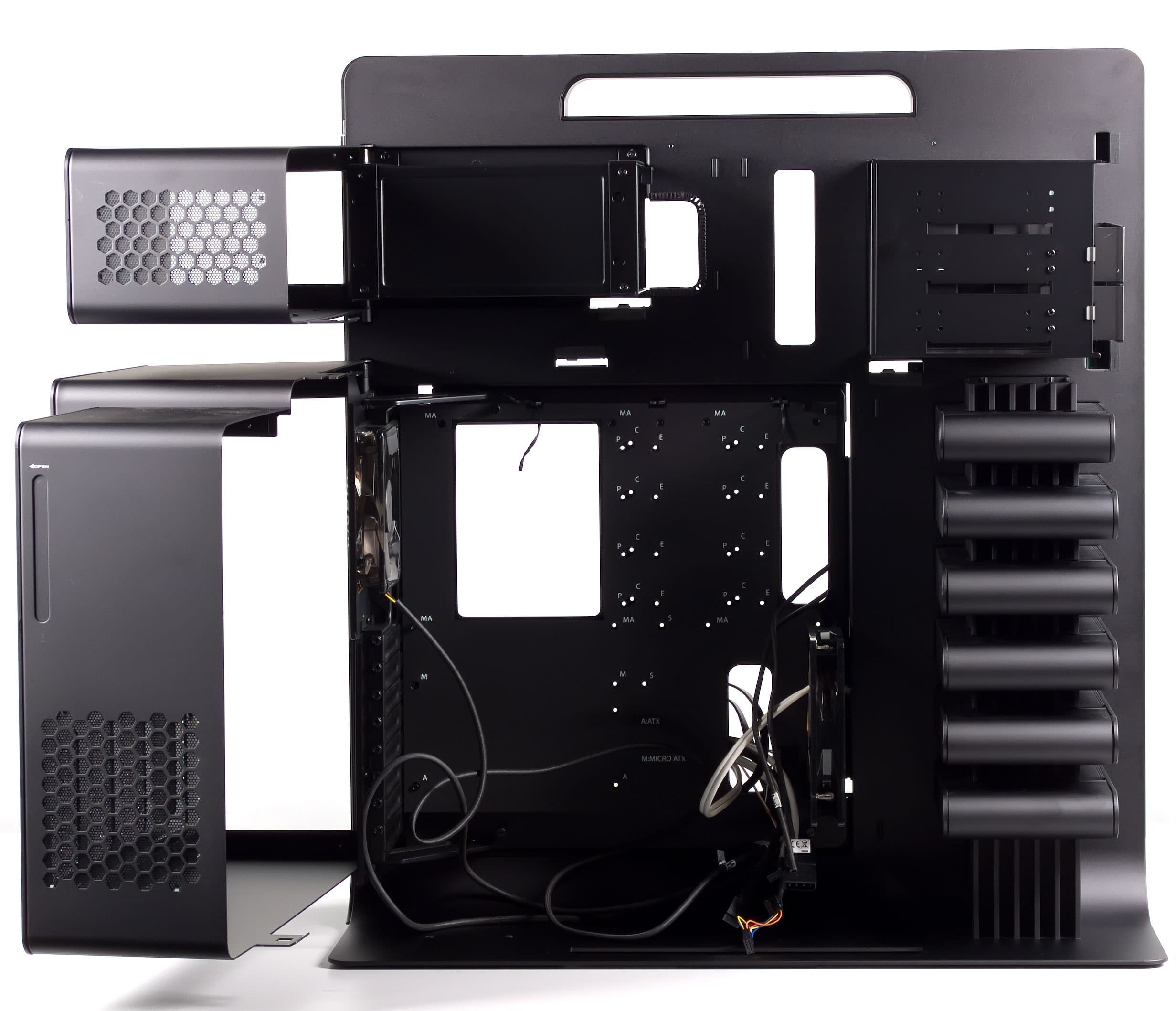 Оригинальность заключается в том, что в отдельных объемах расположены не только платформа и блок питания, но и пятидюймовые устройства, а жесткие диски, как мы уже упомянули выше, устанавливаются в отдельных контейнерах, объемы которых все сообщаются друг с другом благодаря вертикальному каналу, в котором установлены два мелких вентилятора. Упомянутые объемы изолированы друг от друга не абсолютно, так как они немного сообщаются через небольшие отверстия со стороны правой панели, но в принципе подобные отсеки можно считать обособленными.