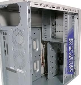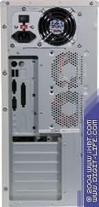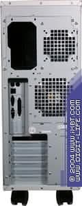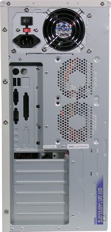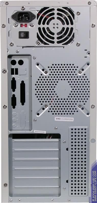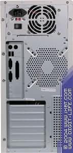 Каркас корпуса выполнен из достаточно толстого анодированного металла, его кромки традиционно завальцованы. Задняя панель корпуса выглядит стандартно для корпусов этого типоразмера. Здесь есть 7 отверстий под выходы плат расширения системной платы (верхнее — под выходы видеокарты AGP — открыто), прорезь под выходы разъемов самой системной платы, вентиляционная решетка вентилятора (допускается крепление вентиляторов большего размера, чем 80x80, на что указывают дополнительные отверстия под винты), вентиляционная решетка пассивного охлаждения. Боковые панели, крепящиеся к каркасу тремя винтами «под отвертку», также оснащены вентиляционными отверстиями в нижней части.
