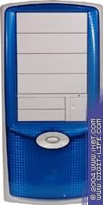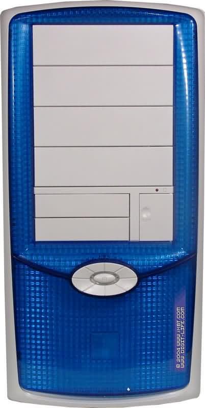 Как ясно из названия модели, корпус стилизован под iMac. От рассмотренных корпусов компании 6688 KA отличается наличием достаточно большой полупрозрачной цветной (синей) вставки на передней панели, пластмассовые накладки которой плавно заходят на боковые панели. Если попытаться оценить первые ощущения от корпуса, то он выглядит «коренастым крепышом» — именно благодаря цветной накладке.