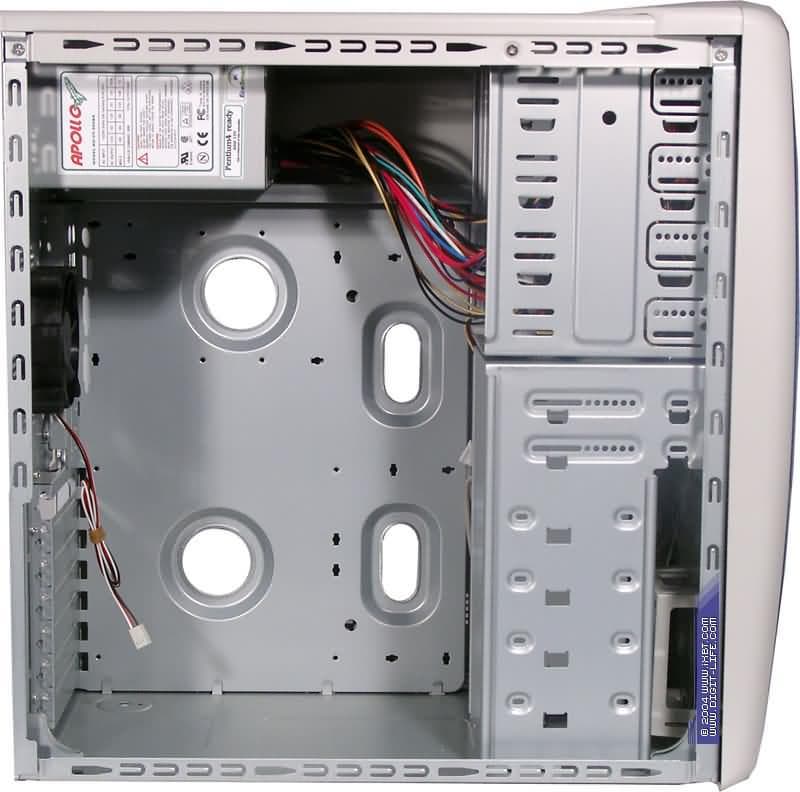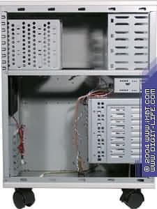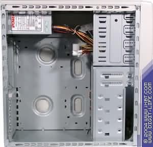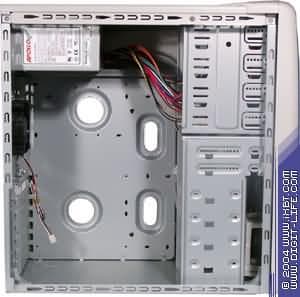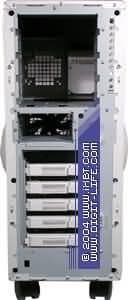 На задней панели уже установлен вентилятор (80x80), с обратной стороны передней панели — посадочное место, допускающее установку дополнительного вентилятора. Посадочная площадка под системную плату выполнена в традиционном для компании стиле — легко снимается, после установки системной платы с процессором, кулером, платами расширения вставляется обратно в корпус по направляющим и фиксируется одним винтом.