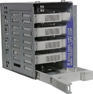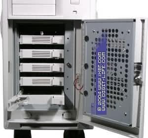 Посадочные отсеки под жесткие диски вынимаются после отжатия пластиковой защелки. Для того чтобы «блок» с диском можно было вставить обратно в корзину, необходимо, чтобы защелка была открыта (в противном случае до конца ее вставить не удастся — второй конец заглушки имеет выступ, удерживающий блок в корзине).