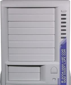 Помимо кнопки питания на передней панели располагается кнопка сброса и рядом с ней — индикатор активности жесткого диска. Задняя панель выглядит стандартно: 7 прорезей под платы расширения, прорезь под разъемы системной платы, два посадочных места под вентиляторы (в данной модели корпуса один вентилятор установлен на передней панели, причем его смещение относительно центра позволяет установить рядом еще один). На боковых панелях в нижней их части расположены отверстия для пассивного охлаждения внутреннего пространства.