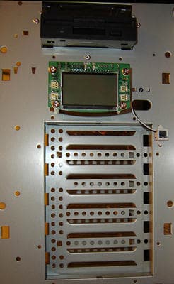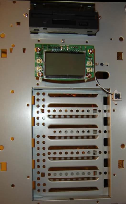Под дверцей располагаются индикаторы питания и активности жесткого диска, многофункциональный ЖК-дисплей и кнопка включения/выключения питания. Кнопки сброса (reset) нет.