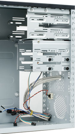 В корпусе предусмотрено 2 посадочных места с внешним доступом для устройств 5,25 дюйма, а также 3 посадочных места для устройств 3,5 дюйма, одно из которых с внешним доступом. Причем все три места расположены в одной корзине на первый взгляд несъемной, но, в принципе, корзину извлечь из корпуса можно, правда для этого необходимо выкрутить три винта, два из передней стенки шасси и один сбоку корзины, после чего нужно сдвинуть корзину немного назад по зацепам и снять. Конструкция не быстросъемная конечно, но с другой стороны времени на данную операцию уходит немного, а процесс установки накопителей она облегчает.