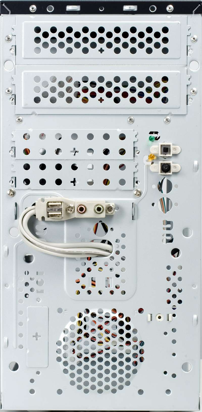 Блок фронтальных разъемов (2 USB, аудиоразъемы) прикручен к передней стенке шасси, также как и контактные блоки кнопок. Крепление передней панели осуществляется посредством распорных элементов, напоминающих цветок, выполнены они из металла, поэтому риск сломать их минимальный, что весьма кстати, так как при демонтаже предней панели усилие нужно приложить весьма ощутимое. Правда нужно отдать должное корпусу, при работе с ним ни разу не возникло впечатление, что сейчас что то сломается или отломится.