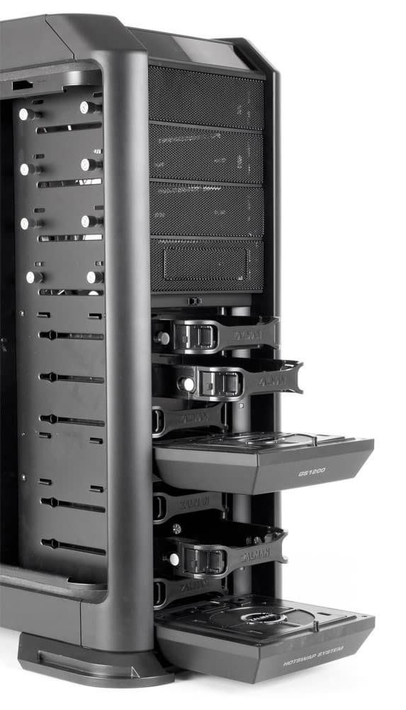 Для установки 3,5-дюймовых жестких дисков предусмотрена система с быстрым доступом: продольная корзина разделена на две части с тремя посадочными местами в каждой; обе части имеют выход на лицевую панель, причем с индивидуальными откидывающимися дверцами, расположенными одна над другой.