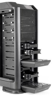 К положительным моментам можно отнести отличное качество изготовления корпуса: все детали хорошо подогнаны, люфтов практически нет (в этом плане неприятным исключением являются контейнеры с HDD). Жесткость боковых панелей можно было бы сделать и повыше — корпус все-таки недешевый. Хорошее впечатление произвел и модуль подключения жестких дисков: в отличие от большинства бытовых корпусов, тут жесткими дисками манипулировать удобно, и попадать в разъемы можно с первого раза. Правда, имеется всего два посадочных места для горячего подключения дисков.