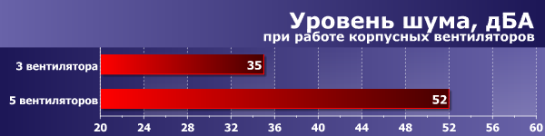 При отключении двух передних вентиляторов ситуация заметно улучшается. Уровень шума вплотную приближается к среднетипичному уровню, то есть при таком режиме работы корпус можно даже поставить на стол.