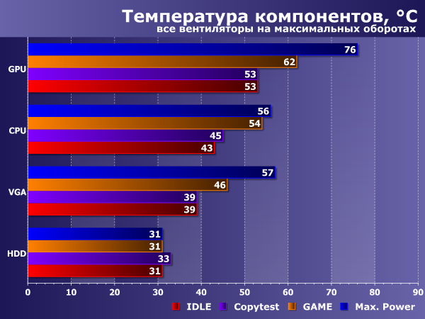 Эффективность системы вентиляции находится на хорошем уровне. Стоит отметить, что отключение передних вентиляторов сказывается только на температуре жесткого диска, да и то не очень заметно, а на температуру остальных компонентов внутри корпуса влияние вообще минимальное.
