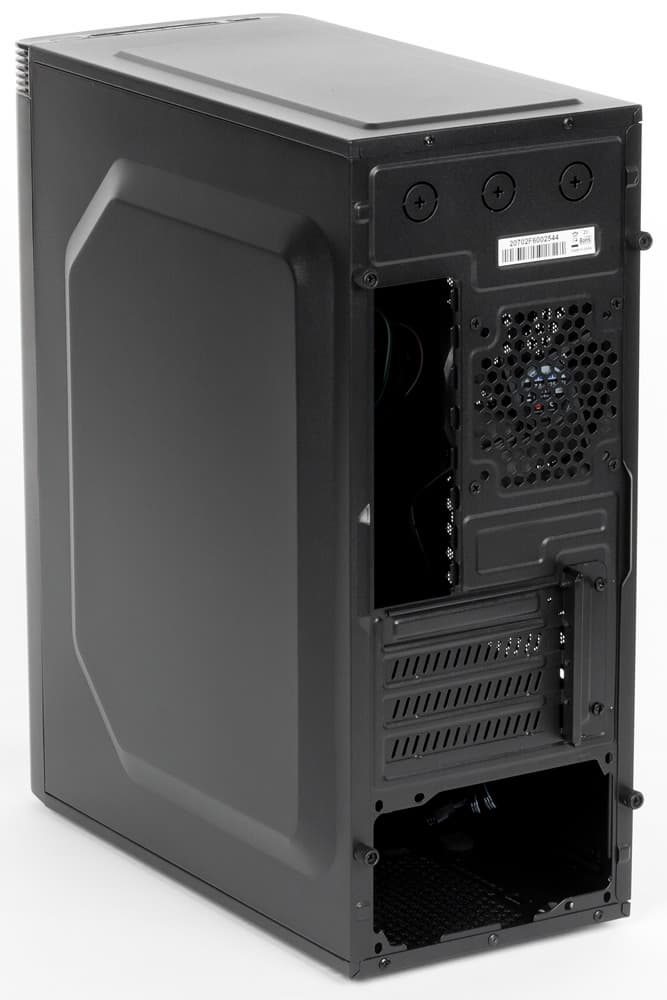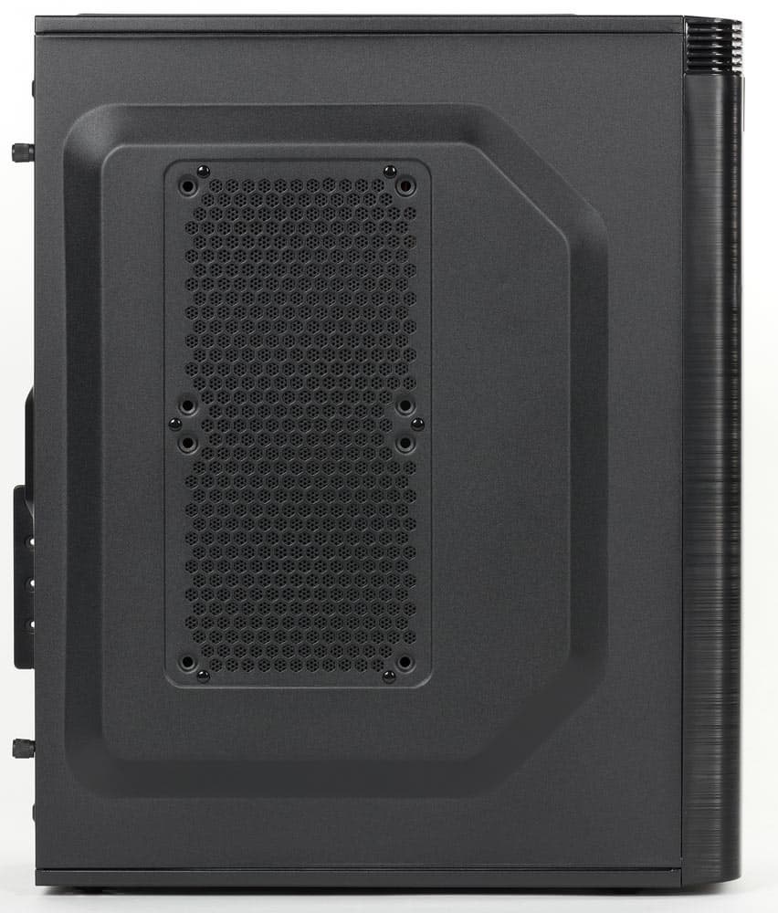 Корпус предлагается в единственном варианте: черного цвета и без прозрачного окна в левой стенке. Это откровенно недорогая модель, ее средняя цена на момент тестирования не превышала двух тысяч рублей (по данным Яндекс.Маркет). Упаковка соответствующая — обычный картон с простеньким монохромным оформлением. Коробка небольшая и очень легкая, всего-то чуть больше 4 кг, и ее вполне можно нести одной рукой, взявшись за один из вырезов, имеющихся в боковых стенках.