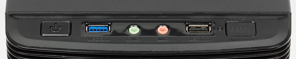 Органы управления находятся в верхнем торце лицевой панели и расположены в один ряд. Крайняя слева кнопка Power с синей светодиодной подсветкой при включении, затем порт USB 3.0, два аудиоконнектора с цветовой маркировкой, порт USB 2.0, красный светодиод дисковой активности, замыкает ряд кнопка Reset. По размеру и форме обе кнопки одинаковые, нажимаются мягко, срабатывают четко, разница лишь в том, что Power немного выступает над плоскостью панели.