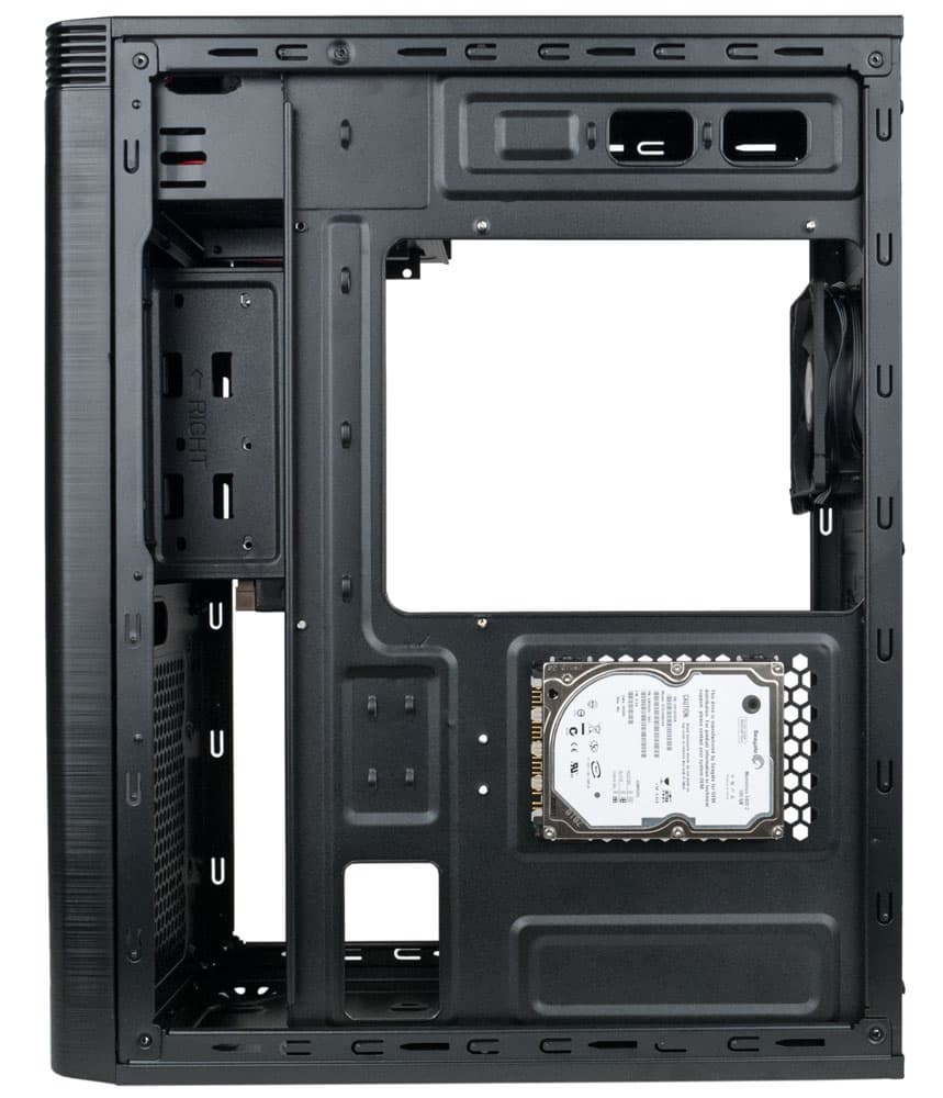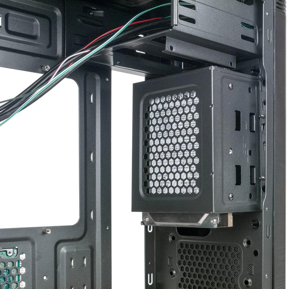 Корзина для жестких дисков всего одна, рассчитанная на два 3,5-дюймовых накопителя. Расположена она вертикально в верхней части фронтальной панели шасси, диски в нее вставляются снизу без всяких салазок или направляющих планок.