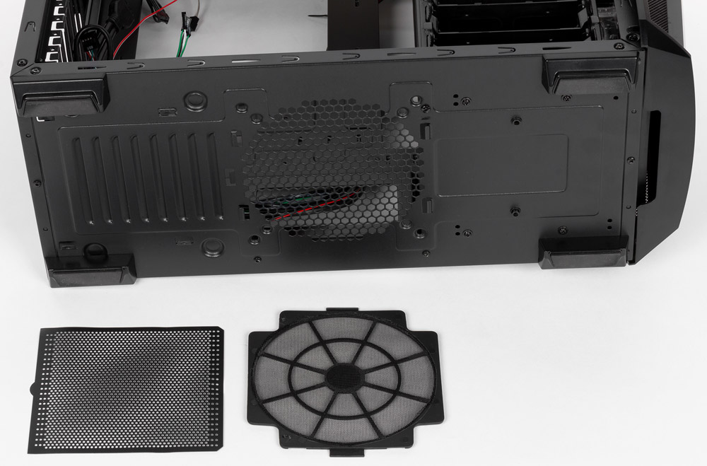 Нижние фильтры по конструкции разные. Тот, что защищает от пыли место для опционального нижнего вентилятора, сделан из сетки на рамке, а отверстия в днище шасси под блоком питания закрывает лист из тонкого пластика с мелкими отверстиями. Оба нижних фильтра снимаются снаружи без вскрытия корпуса, и их можно назвать быстросъемными, но корпус при извлечении и установке этих фильтров придется сильно наклонять или даже класть на бок: делать такие процедуры на ощупь не получится.