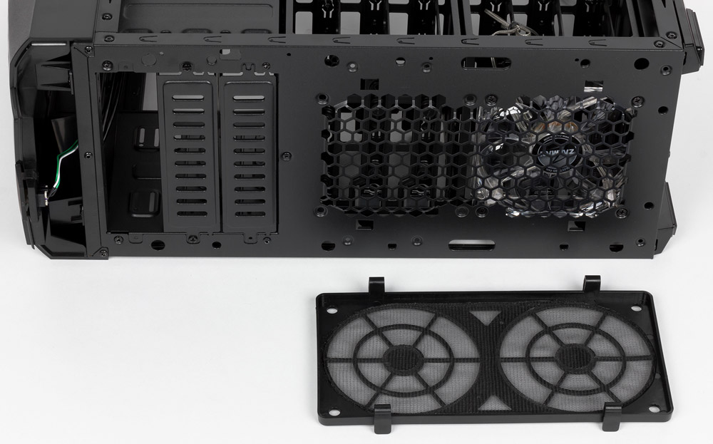 Фильтры установлены спереди и снизу. Для доступа к фронтальному фильтру придется снимать лицевую панель — это не самая трудоемкая операция, однако быстросъемным этот фильтр мы не назовем. Он закрывает оба посадочных места для вентиляторов, а сделан из мелкоячеистой капроновой сетки на пластиковой рамке. Крепится фильтр защелками к прорезям в металле передней плоскости шасси.