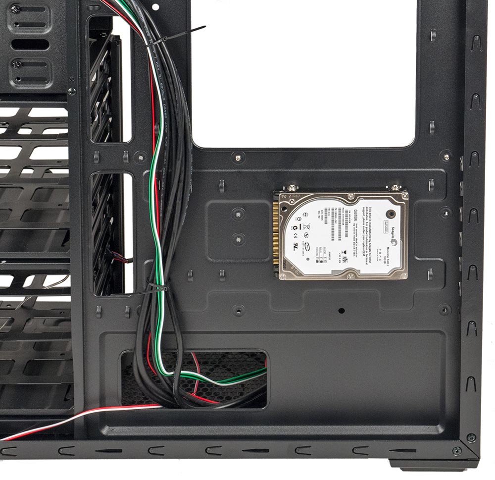 Разного рода кабели можно проложить за подложкой системной платы, для чего в ней имеются большие отверстия без резиновых заглушек (что делать, корпус-то бюджетный). Завальцованы и края этих отверстий, и прочие кромки, о которые может пораниться сборщик.
