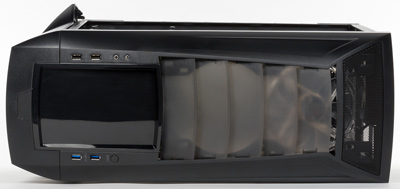 Cлотов для 5,25-дюймовых устройств уже не пять, а три, причем выход на лицевую панель есть всего у одного, самого верхнего. Закрывается он оригинально — не извлекаемой заглушкой, а шторкой, которая опускается вниз. Причем шторка подпружиненная, опустить и поднять ее можно легким толчком, вот только звук при этом получается довольно громким.