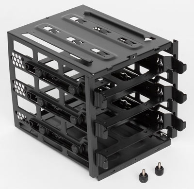 Для установки жестких дисков вариантов немало. Их можно устанавливать в поперечную корзину, состоящую из двух независимо извлекаемых отсеков каждый на три посадочных места с салазками, а еще два накопителя могут быть размещены на упомянутых в предыдущем абзаце переходниках. Наконец, 2,5-дюймовый HDD или SSD можно установить на правой стороне подложки системной платы.