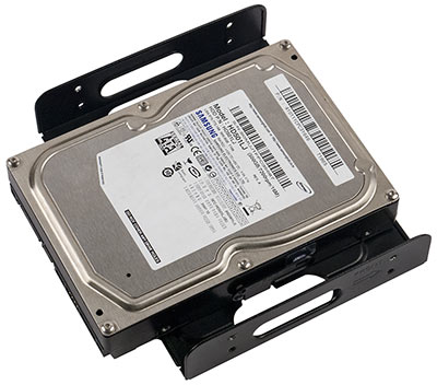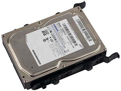 Способ установки HDD и SSD в разных местах разный. В корзине используются салазки, в которых 3,5-дюймовые накопители крепятся боковыми штифтами, а 2,5″ — винтами снизу. Сами салазки вдвигаются в корзину с помощью цилиндрических выступов, снабженных резиновыми амортизаторами. Таким образом, прямой отвод тепла к металлу шасси отсутствует, но накопители находятся в зоне действия вентиляторов.