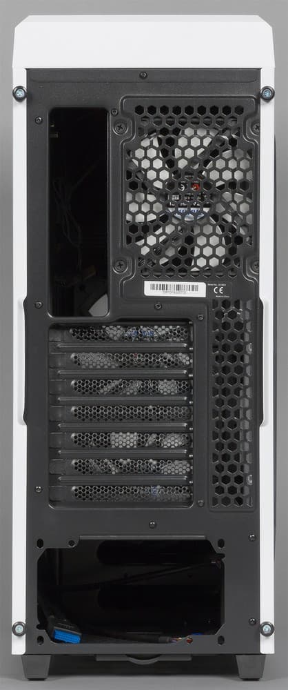 Задняя стенка корпуса ничем не примечательна, здесь находится вырез под основные порты ввода/вывода и блок питания, штампованная решетка корпусного вентилятора, а в качестве дополнительных вентиляционных отверстий служат перфорированные заглушки слотов для плат расширения и прямоугольная область справа от них.