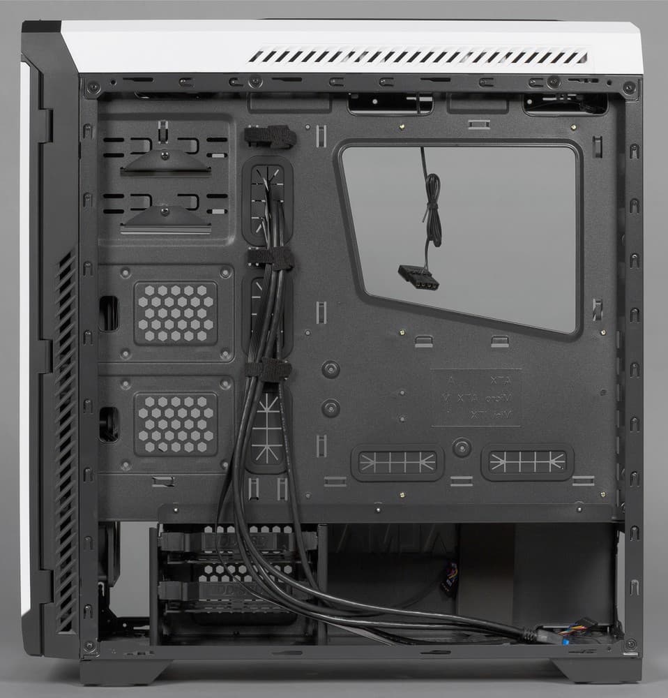 Два посадочных места для установки вентиляторов типоразмера 120 или 140 мм находятся на передней стенке шасси, непосредственно за пластиковой фронтальной панелью. Комплектные вентиляторы имеют типоразмер 120 мм и не подсвечиваются в процессе работы. При желании их можно сместить немного выше или ниже в зависимости от того, что требует большего охлаждения: жесткие диски или видеокарта.