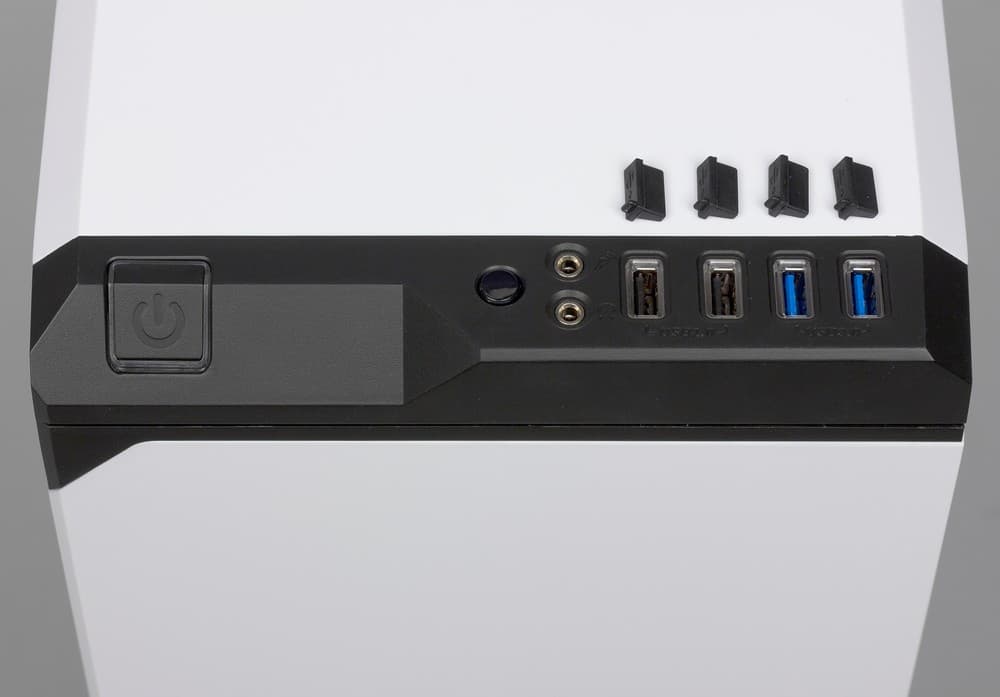 Открывать дверцу нужно только для получения доступа к оптическому приводу или другому устройству с аналогичными габаритами, то есть, по факту, делать это придется крайне редко. Все порты, кнопки и индикаторы вынесены на край верхней стенки корпуса, при этом кнопка включения расположена на скошенном торце, что делает ее более удобной для нажатия как при напольном, так и при настольном размещении.