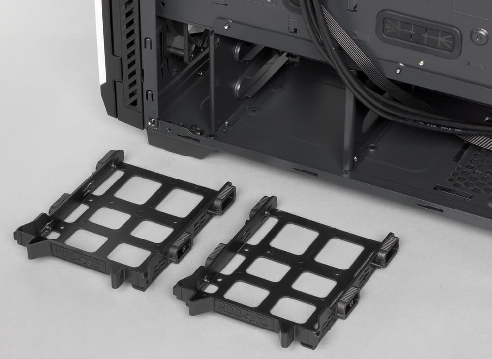 Основная корзина для 3,5″ дисков расположена в нижней части корпуса, доступ к ней открывается после снятия правой стенки корпуса. Корзина двухместная, диски устанавливаются в быстросъемные пластиковые лотки. В случае установки полноразмерного HDD фиксация винтами не требуется, лоток просто «натягивается» на диск и держится на нем за счет 4 пластиковых штырьков. Лоток надежно сидит на диске, а также очень быстро устанавливается и извлекается из корпуса, вот только качество фиксации самого лотка в корзине оставляет желать лучшего: сильный люфт наблюдается в как горизонтальной, так и в вертикальной плоскости.