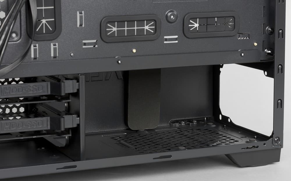 Его внутренний объем также разделен на две части: небольшая нижняя часть предназначена для размещения блока питания и корзины для двух полноразмерных HDD, а в верхней находится основание для установки системной платы, универсальные отсеки для 5,25″ устройств с внешним доступом, которые также можно использовать для установки 3,5″ и 2,5″ накопителей. Еще два диска ноутбучного формата можно прикрутить к внутренней стенке в месте сразу под пятидюймовыми отсеками.