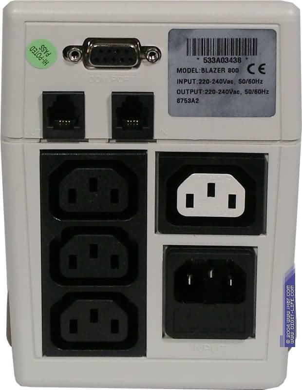 Задняя панель ничем особенно не отличается от панелей других аналогичных решений: коммуникационный порт для управления ИБП, 4 розетки для подключения нагрузки (из них одна, помеченная белой краской, обеспечивает только фильтрацию), пара разъемов для подключения телефонного кабеля, собственно разъем питания устройства.