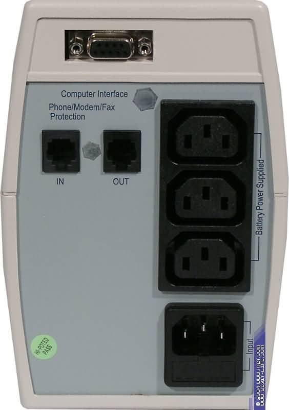 Стандартная раскладка: три розетки для подключения нагрузки, коммуникационный порт RS-232, пара розеток для подключения телефонного шнура и розетка подключения питания ИБП.